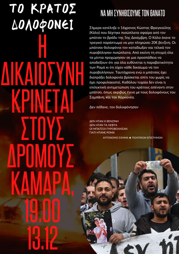 Ξημερώματα της Δευτέρας 5/12 ο 16χρονος Ρομά Κώστας-Κάλο-Φραγκούλης δέχεται σφαίρα στο κεφάλι εν ψυχρώ από μπάτσους της ΕΛ.ΑΣ. ,κατα τη διάρκεια της καταδίωξής του, αφότου είχε φύγει από πρατήριο καυσίμων χωρίς να πληρώσει το αντίτιμο των 20€. Οι αντιφατικές δηλώσεις της ΕΛ.ΑΣ απο την πρώτη στιγμή καταρρίπτονται μια προς μια από τα γεγονότα που βγαίνουν στην δημοσιότητα, ενώ τα καθεστωτικά μέσα συνεχίζουν να αναπαράγουν την ψεύτικη αλήθεια που συμφέρει το εξουσιαστικό συστημα. Για περίπου μια εβδομάδα η κατάσταση της υγείας του παρέμενε κρυφή μέχρι σήμερα που ανακοινώθηκε ο θάνατός του.