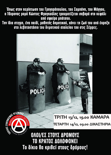 Η κρατική εξουσία βασίζεται στη βία. Γι' αυτό, λοιπόν, το κράτος συνεχίζει να δολοφονεί, όπως μαρτυρά η δολοφονική απόπειρα μπάτσων κατά του 16χρονου Ρομά, Κώστα Φραγκούλη, ένα χρόνο μετά την κρατική δολοφονία του 21χρονου Ρομά, Νίκου Σαμπάνη στο Πέραμα. Το κράτος, ενώ επιβάλλει τη φτώχεια και την ανέχεια, εντείνοντας παράλληλα την εκμετάλλευση και το ξήλωμα των δικαιωμάτων των από τα κάτω, ταυτόχρονα εντείνει την καταστολή και παρέχει πολιτική και επικοινωνιακή κάλυψη στον κατασταλτικό του βραχίονα, με αποτέλεσμα την αποθράσυνση των αστυνομικών δυνάμεων και τα συνεχή περιστατικά αστυνομικής αυθαιρεσίας. Το κράτος αντιλαμβάνεται ότι η όξυνση των ταξικών αντιθέσεων επιτάσσει την αναβάθμιση της καταστολής, προκειμένου να αντιμετωπιστεί η γενικευμένη κοινωνική δυσαρέσκεια και οργή. Γι' αυτό, ενώ συνέβη ο πυροβολισμός στο κεφάλι του 16χρονου Κώστα Φραγκούλη, μία μέρα πριν την επέτειο της κρατικής δολοφονίας του 15χρονου αναρχικού μαθητή Αλέξανδρου Γρηγορόπουλου, ψηφίστηκε στη Βουλή εφάπαξ 600 ευρώ για τους αστυνομικούς εν είδει ευχαριστίας για τις «προσφερόμενες υπηρεσίες» τους. Αυτός είναι ο κρετινισμός της εξουσίας. Αυτό το σύστημα της καταπίεσης, της εκμετάλλευσης και της αδικίας μπορεί να αναπαραχθεί μόνο μέσω της βίας. Και μέσω της βίας θα ανατραπεί, γιατί οι κυρίαρχοι δεν πρόκειται να δεχτούν να απολέσουν τα προνόμια και την εξουσία τους με ειρηνικό τρόπο.