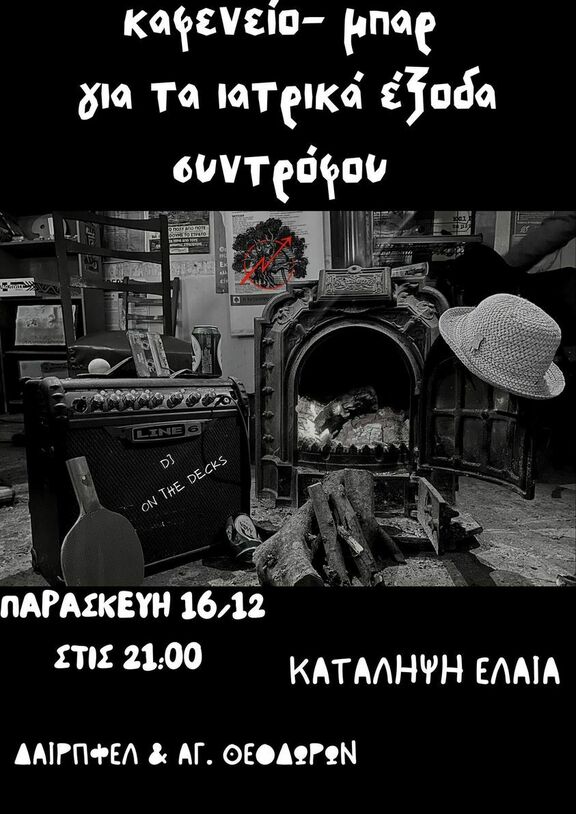 Στο κομμάτι της έμπρακτης αλληλεγγύης που μας αντιστοιχεί θα κάνουμε καφενείο- μπαρ για να μαζέψουμε χρήματα για τα ιατρικά έξοδα του συντρόφου την Παρασκευή 16/12 στις 21:00