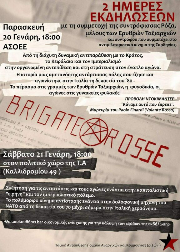 2ήμερο εκδηλώσεων με τη συμμετοχή της συντρόφισσας Ρόζα, μέλους των Ερυθρών Ταξιαρχιών και συντρόφου που συμμετέχει στο αντιμιλιταριστικό κίνημα της Σαρδηνίας