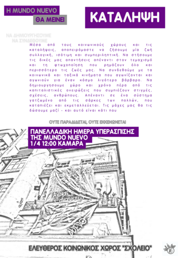 Στηρίζουμε την πανελλαδική πορεία υπεράσπισης της κατάληψης Mundo Nuevo