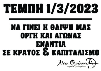 Το εύλογο και επιτακτικό ερώτημα που αναδύεται από όλους/ες όσους/ες βιώνουμε καθημερινά την καταπίεση και την εκμετάλλευση αυτές τις στιγμές είναι ένα και μοναδικό. Τι πρέπει να γίνει για να μην επαναληφθούν άλλες τραγωδίες που μας γεμίζουν με θλίψη και οργή. Για εμάς, τραγωδίες σαν αυτή στα Τέμπη θα εκλείψουν μόνο όταν πάψει το κέρδος να έχει μεγαλύτερη αξία από την ανθρώπινη ζωή. Αυτό όμως είναι κάτι που δεν μπορεί να επιτευχθεί με ημίμετρα μέσα στα πλαίσια του υπάρχοντος μοντέλου κοινωνικής οργάνωσης. Για να γίνει αυτό είναι αναγκαίο όλοι/ες εμείς οι καταπιεσμένοι/ες και εκμεταλλευόμενοι/ες να συνειδητοποιήσουμε την αναγκαιότητα της κοινωνικής επανάστασης, της κατάργησης του κράτους, της εξάλειψης του καπιταλισμού και της αναδιοργάνωσης της κοινωνίας πάνω σε ριζικά νέες βάσεις˙ στις βάσεις της ελευθερίας, της ισότητας και της αλληλοβοήθειας.