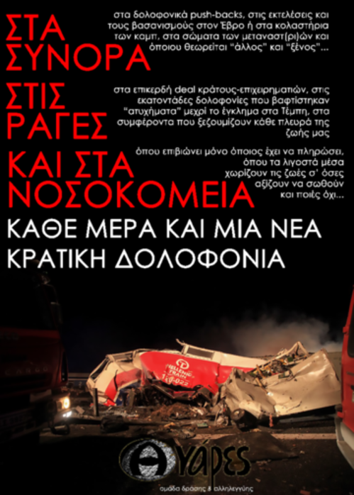 Η κρατική αφήγηση για "ανθρώπινο λάθος" δεν συγκινεί κανέναν, όσο και να προσπαθούν τα παπαγαλάκια των ΜΜΕ να διασφαλίσουν. Εμείς ξέρουμε ότι κράτος και κεφάλαιο δολοφονούν. Από τους νεκρούς στα σύνορα και στις ακτές, μέχρι τα νοσοκομεία και τα "εργατικά ατυχήματα".
