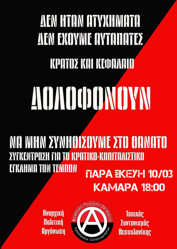 Ταυτόχρονα, τις τελευταίες μέρες τα ΜΜΕ έχουν επιδοθεί σε μια απέλπιδα προσπάθεια να αποσιωπήσουν τις ευθύνες του κρατικού μηχανισμού αλλά και τις ιδιωτικής εταιρείας. Για αυτό επικαλούνται το ανθρώπινο λάθος και επιχειρούν να χρησιμοποιήσουν τον σταθμάρχη ως αποδιοπομπαίο τράγο για αυτή την κρατική - καπιταλιστική δολοφονία. Όλο αυτό το σύντομο διάστημα οι βασικές αντιθέσεις του συστήματος κοινωνικής οργάνωσης που ζούμε έχουν γίνει ξεκάθαρες. Μιλάμε για ένα σάπιο εξουσιαστικό- καπιταλιστικό σύστημα που αντιλαμβάνεται την ανθρώπινη ζωή μόνο με όρους κερδοφορίας, ενώ ταυτόχρονα οι ένστολοι δολοφόνοι δεν διστάζουν να επιτεθούν με σφοδρότητα στις τεράστιες διαδηλώσεις, σε Αθήνα και Θεσσαλονίκη. Χτυπάνε τις μεγάλες διαδηλώσεις που ενσαρκώνουν την κοινωνική οργή, και ακόμη περισσότερο τα μπλόκα του οργανωμενου αναρχικού κινήματος. Βρισκόμαστε σε ταξικό πόλεμο, είμαστε εχθροί, και ως τέτοιους μας αντιμετωπίζουν, είμαστε δυο κόσμοι σε σύγκρουση. Από την μία οι κρατικοί ταγοι και οι επιχειρηματίες, μαζί με τους ένστολους δολοφόνους και από την άλλη ο κόσμος της εργασίας, οι φοιτητές, οι πληβείοι αυτού του κόσμου, μέσα από τις καταλήψεις, τα κατειλημμένα εργοστάσια και τις διαδικασίες αυτοδιεύθυνσης δομουμε έναν καινούριο κόσμο.