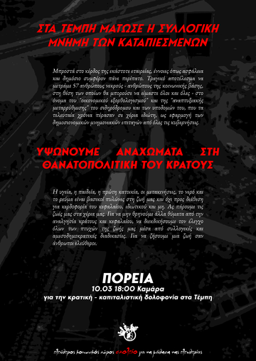 Διαδήλωση ενάντια στο κρατικό-καπιταλιστικο έγκλημα στα Τέμπη Παρασκευή 10/3 στις 6μμ Καμάρα