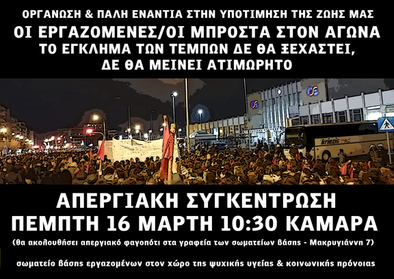 Κάλεσμα στην Γενική Απεργία, 16/3 10:30 στη Καμάρα, ενάντια στο κρατικό-καπιταλιστικό έγκλημα στα Τέμπη.