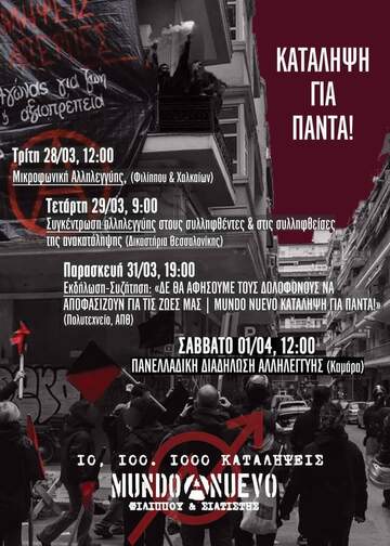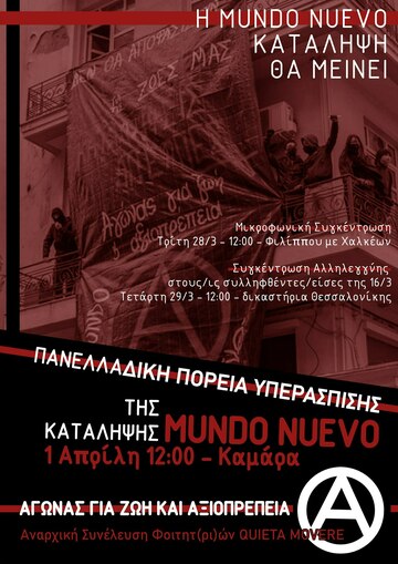 Το μεσημέρι της 16ης Μάρτη, στα πλαίσια της πανελλαδικής απεργιακής κινητοποίησης, σύντροφοι και συντρόφισσες της Mundo Nuevo προχώρησαν σε μία δυναμική πράξη διεκδίκησης ανακαταλαμβάνοντας την αναρχική κατάληψη Mundo Νuevo, παρά τις διπλές λαμαρίνες, τις κάμερες και τους συναγερμούς που τα τσιράκια του κράτους είχαν από μήνες πριν τοποθετήσει. Ωστόσο, η ανακατάληψη της Mundo Nuevo απαντήθηκε άμεσα και βίαια καθώς οι ένστολοι δολοφόνοι του κράτους έδειξαν για ακόμη μία φορά το κτηνώδες πρόσωπό τους και επιτέθηκαν με περισσή μανία στον αλληλέγγυο κόσμο και στην περιφρούρηση του κτηρίου. Κρότου λάμψης σε ευθεία βολή, ασύδοτη χρήση χημικών και θρασύτατα καθάρματα που χτυπούν όποιον/α βρεθεί στο διάβα τους - να τι αντίκριζε κανείς εκείνο το μεσημέρι στο στενό της Φιλίππου και στην ευρύτερη γειτονιά της κατάληψης ύστερα από την επίθεση των μπάτσων. Μερικά λεπτά μετά, τα ίδια καθάρματα προχώρησαν στην εκ νέου εκκένωση του κτηρίου και στη σύλληψη 15 συντρόφων και συντροφισσών που βρίσκονταν μέσα στην κατειλημμένη Mundo Nuevo.