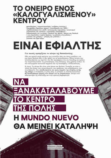 Για ποιούς προορίζεται το κέντρο της Θεσσαλονίκης; Εδώ και αρκετό καιρό φαίνεται πως εκτοπίζει όσες και όσους μοιάζουν «να μην έχουν δουλειά εδώ» ή δεν ήρθαν για να καταναλώσουν. Όλους αυτούς που κατασκευάζονται ως περιττοί, που δεν προσφέρουν στο city branding και χαλάνε την τουριστική εικόνα: τις μετανάστριες, τους αστέγους, τους χρήστες ουσίων, τα πιο υποτιμημένα κοινωνικά κομμάτια και τις καταλήψεις / συλλογικότητες. Κι όμως. Το κέντρο δεν είναι μόνο ψώνια και δουλειά. Συνεχίζει να είναι ο τόπος που ζούμε, που συναντιόμαστε, που αράζουμε, που μοιραζόμαστε, που αγωνιζόμαστε. Και επειδή είμαστε και εμεις κομμάτι της ιστορίας αυτής της πόλης( οι επισφαλείς, οι μπας κλας, οι ρυπαροί, οι γνωστές-άγνωστες), θα διεκδικήσουμε χώρους στο κέντρο για να ανασαίνουμε, κόντρα στον οδοστρωτήρα της ανάπτυξης και στην κρατική βαρβαρότητα.