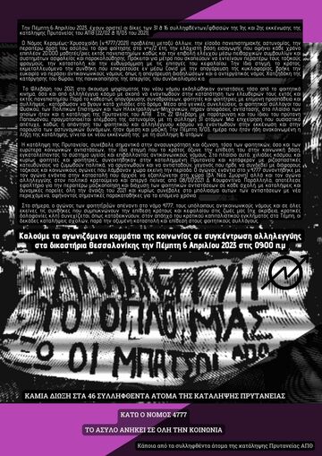 Την Πέμπτη 6/4 δικάζονται τα 46 συλληφθέντα από τις 2 εκκενώσεις των καταλήψεων της Πρυτανείας τον Φεβρουάριο και τον Μάρτιο του 2021. Η κατάληψη της Πρυτανείας και η άμεση επανακατάληψη μετά την πρώτη εκκένωση, ήταν κομβικά σημεία του φοιτητικού κινήματος του 2021 ενάντια στον νόμο 4777 και την εκπαιδευτική αναδιάρθρωση. Ο αγώνας αυτός συνέβη στην καρδιά του lockdown που επιβλήθηκε λόγω covid, και ήρθε να ανοίξει μετά από καιρό τα πανεπιστήμια με καταλήψεις στις σχολές. Όλα αυτά σε μια συγκυρία όπου δεν μας επιτρεπόταν να βγούμε από τα σπίτια μας, μας επιβλήθηκε η κοινωνική απομόνωση και μας απαγορευόταν να αντιδράσουμε απέναντι στα νομοσχέδια που βλέπαμε να περνάνε το ένα μετά το άλλο υποβαθμίζοντας κι άλλο τις ζωές μας (4777, αντεργατικός νόμος Χατζηδάκη, τρομονόμος στην τέχνη). Απέναντι σε όλα αυτά, συναντηθήκαμε με τα συμφοιτητά μας, ανοίξαμε τις σχολές με καταλήψεις και βρισκόμασταν μέσα στο πανεπιστήμιο καθημερινά, μετατρέποντας την ατομική ευθύνη σε συλλογική ανευθυνότητα.