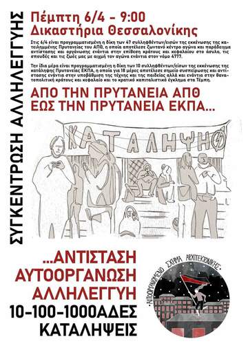 Στις 6 Απρίλη, δικάζονται οι 47 συλληφθέντες/είσες της κατάληψης της πρυτανείας του ΑΠΘ στην Θεσσαλονίκη, καθώς και οι 10 συλληφθέντες/είσες της κατάληψης της πρυτανείας του ΕΚΠΑ στην Αθήνα.