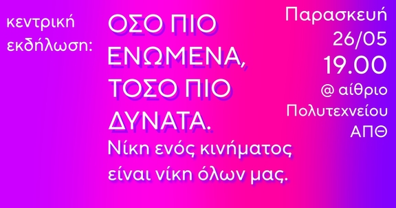 Σας περιμένουμε όλες, όλους και όλα για να συζητήσουμε για όσα μας ενώνουν και μας δίνουν δύναμη να συνεχίσουμε να παλεύουμε για έναν καλύτερο κόσμο!