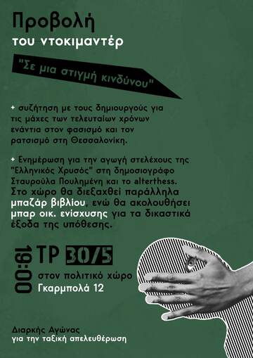 Προβολή του ντοκιμαντέρ "Σε μια στιγμή κινδύνου " και συζήτηση με τους δημιουργούς για τις μάχες των τελευταίων χρόνων ενάντια στο φασισμό και το ρατσισμό στη Θεσσαλονίκη και τη Βόρεια Μακεδονία.