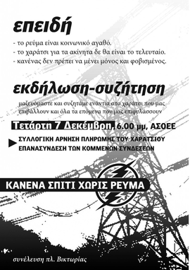 Σε όποιο σπίτι επιχειρηθεί να διακοπεί η σύνδεση να μην ανοίξουμε και να μαζευτούμε όσο το δυνατό περισσότεροι για να σταματήσουμε τα εργολαβικά συνεργεία. Να παρέμβουμε σε τοπικά υποκαταστήματα της ΔΕΗ να διακόπτουμε τη λειτουργία τους, να ενημερώνουμε τον κόσμο και τους εργαζόμενους καλώντας τους σε αλληλεγγύη.