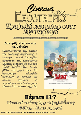Συνεχίζουμε και αυτήν την Πέμπτη 13/7 με προβολή στο θερινό Σίνε Εξωστρεφή. Αυτή τη φορά πιο χαλαρά, με μπαρ και μουσικούλα και το «Αστερίξ και η κατοικία των θεών».9μμ μπαρ - προβολή στις 9.30μμ - μπαρ για κλείσιμο!