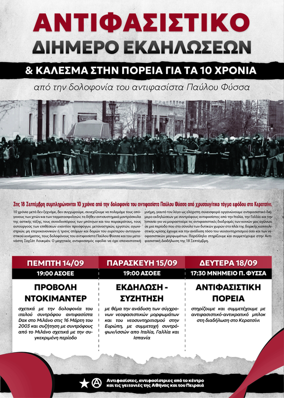 Αντιφασιστικό διήμερο εκδηλώσεων - Κάλεσμα στην Πορεία για τα δέκα χρόνια από την δολοφονία του αντιφασίστα Παύλου Φύσσα.
