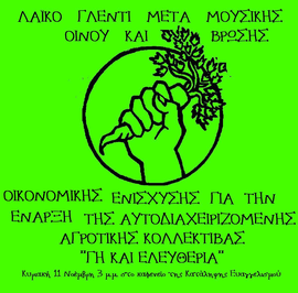 Κυριακη 11 νοεμβρη απο τις 3 μ.μ. και μετα θα λαβει χωρα εις τη καταληψη ευαγγελισμου λαϊκο γλεντι μετα μουσικης, οινου, ρακης και βρωσης για την οικονομικη ενισχυση της αυτοδιαχειριζομενης αγροτικης κολλεκτιβας " Γη κ' Ελευθερια".