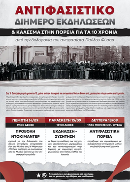 Συνέλευση για τη διοργάνωση μπλοκ στην κεντρική πορεία για τα 10 χρόνια απ'τη δολοφονία του αντιφασίστα Π.Φύσσα
