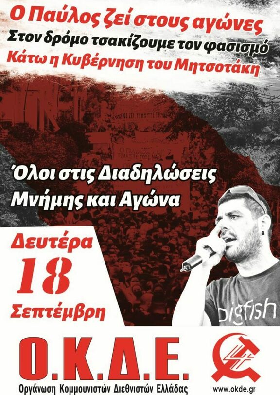 - Στην αυριανή αντιφασιστική πορεία για τα 10 χρόνια από τη δολοφονία του Παύλου Φύσσα από τάγμα εφόδου της Χρυσής Αυγής - Δευτέρα 18 Σεπτεμβρίου, 7μμ, Καμάρα