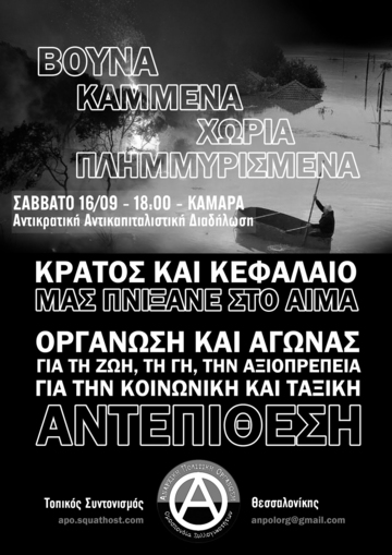 Είναι το κράτος, οι τοπικοί του παράγοντες και το κεφάλαιο που πνίξανε τη Θεσσαλία, που γνώριζαν την ανυπαρξία αντιπλημμυρικών έργων ενώ είχαν δοθεί εκατομμύρια για την κατασκευή τους, που δεν ειδοποίησαν χιλιάδες ανθρώπους ώστε να απομακρυνθούν από τα σπίτια τους και να μεταβούν σε ασφαλή σημεία, που μπάζωσαν γεφύρια για να περνάνε με ασφάλεια τα φορτηγά των κατασκευαστικών εταιρειών για τη μεταφορά ανεμογεννητριών πνίγοντας χωριά, που ξεκίνησαν μετά από 2 ολόκληρες μέρες τις διασώσεις εγκλωβισμένων, που 4 νομοί δεν έχουν ρεύμα και πόσιμο νερό, που αδιαφορούν για τα κοράκια που αισχροκερδούν πάνω στη δυστυχία και τις ανάγκες των ανθρώπων για ένα μπουκάλι νερό, που διακινδυνεύουν την υγεία όσων βρίσκονται στη Θεσσαλία, και όχι μόνο, με τις ασθένειες που εγκυμονούνται μέσα σε αυτή την υδάτινη κόλαση της λάσπης, των νεκρών, των φυτοφαρμάκων, των περιττωμάτων και του πετρελαίου. Είναι οι ίδιοι που χτύπησαν και προσήγαγαν δεκάδες ανθρώπους- κατοίκους των πληγεισών περιοχών κατά τη διάρκεια της συγκέντρωσης διαμαρτυρίας για το έγκλημα που έχει συντελεστεί, έξω από την περιφέρεια Θεσσαλίας, όπου ο πρωθυπουργός προσέφερε ψίχουλα στον κόσμο για να κάνει ακριβώς τι (;). Για να μισοχτίσει και πάλι τη ζωή του, περιμένοντας το επόμενο έγκλημα. Τη ζωή που δεν πρόλαβε να συμμαζέψει μετά και τις πλημμύρες του 2020. Η ζωή όμως όσων δολοφονήθηκαν δεν ξαναχτίζεται, ούτε όσων βιώνουν και ξαναβιώνουν τη βαρβαρότητα μέσα στην οποία μας πνίγουν, την αβεβαιότητα για το αύριο και το φόβο που μας ενσταλάζουν.