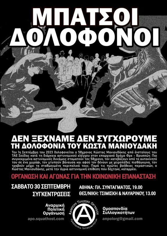 Η δολοφονία του Κωστή Μανιουδάκη στα Χανιά αποτέλεσε (άλλη μία) απροκάλυπτη δολοφονία από την αστυνομία. Μέσα στο κανιβαλιστικό περιβάλλον που δημιουργεί ο καπιταλισμός, με την εντατικοποίηση της εργασίας, το υπέρογκο κόστος ζωής, την στρατιωτικοποίηση της κοινωνικής ζωής, το "πάτημα" των επενδύσεων κυριολεκτικά επάνω σε καμμένη/πλημμυρησμένη γη κ.ά. , γινόμαστε μάρτυρες της πλήρους υποτίμησης της ζωής μας. Οι δολοφονίες και η πλήρης εξαθλίωση πληθυσμών που περισσεύουν είναι προϋπόθεση της κοινωνικής αναπαραγωγής του κράτους και του κεφαλαίου ως σχέσεων εγγενώς συνδεδεμένων με την εκμετάλλευση. Από τα σύνορα και τους αυτοκινητοδρόμους μέχρι τα νοσοκομεία, τις φυλακές, τα εργοτάξια και τις πληγείσες περιοχές από πλημμύρες και πυρκαγιές, οι ζωές της κοινωνικής βάσης στερούνται ολοένα περισσότερο της αξίας τους.