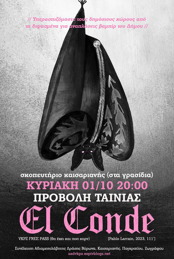 Την Κυριακή 1/10/23, στις 20.00, σας καλούμε να παρακολουθήσετε την προβολή της ταινίας "El Conde" (Pablo Larrain, 2023, 111') που θα πραγματοποιηθεί στα γρασίδια του Σκοπευτηρίου Καισαριανής.