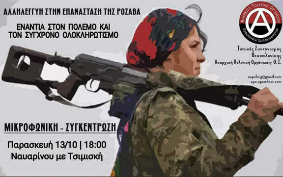 Το παράδειγμα της Ροζάβα αποδεικνύει οτι η αυτοοργάνωση των από τα κάτω και της κοινωνικής ζωής μέσω της συλλογικής αυτοδιοίκησης δεν είναι ουτοπία, αλλά η μόνη απάντηση απέναντι στην κρατική καπιταλιστική βαρβαρότητα που επιβάλλεται ως μοναδική επιλογή. Ως αναρχικοί στεκόμαστε αλληλέγγυοι στον αγώνα αυτό αλλά και σε κάθε αγώνα που στοχεύει στην κοινωνική επανάσταση και στη δημιουργία ενός κόσμου ελευθερίας και ισότητας.