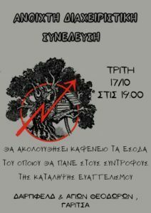 Μέτα την συνέλευση θα ακολουθήσει καφενείο. Όσα χρήματα μαζευτούν θα σταλου΄ν στην Κρήτη στους συντρόφους της Κατάληψης Ευαγγελισμός για τις ανάγκες που έχουν προκύψει μετά την εκκένωση της.