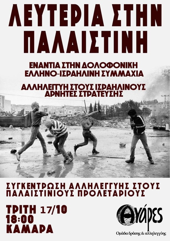 Στηρίζουμε τη συγκέντρωση αλληλεγγύης στους/ις προλετάριους/ες της παλαιστίνης σήμερα Τρίτη 17/10, 18:00 Καμάρα.