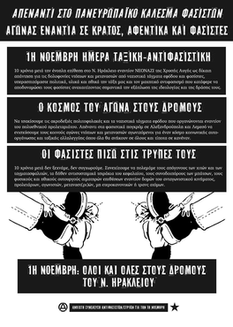 10 χρόνια μετά την ένοπλη επίθεση στο Ν.Ηράκλειο εναντίον ΝΕΟΝΑΖΙ της Χρυσής Αυγής ως δίκαιη απάντηση για τις δολοφονίες ντόπιων και μεταναστών από ναζιστικά τάγματα εφόδου και φασίστες, υπερασπιζόμαστε πολιτικά, υλικά και ηθικά την τάξη μας και τον μαχητικό αντιφασισμό που κατάφερε να αποδυναμώσει τους φασίστες αναχαιτίζοντας σημαντικά την εξάπλωση της ιδεολογίας και της δράσης τους.