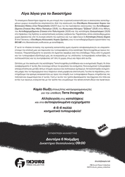 Στις 14/2/22 καλεστήκαμε, από την κρατική ασφάλεια, μαζί με άλλα άτομα για προκαταρκτική εξέταση στις 23/2/22 ως "ύποπτοι" να δώσουμε εξηγήσεις σχετικά με τη δικογραφία που αφορά την εκκένωση της κατάληψης. Η ογκοδέστατη δικογραφία εμπεριέχει κατηγορίες για διατάραξη οικιακής ειρήνης, οπλοκατοχή, κατασκευή και κατοχή εκρηκτικών υλών, παράβαση του νόμου περί φωτοβολίδων και πυροτεχνημάτων, ρευματοκλοπή, παράβαση του νόμου ραδιοσυχνοτήτων και πλαστογραφία. Μέσα στα άτομα που καλέστηκαν, πέρα από κάποια που συμμετέχουμε στην συλλογικότητα, είναι και άτομα που δεν είχαν κάποια ενεργή συμμετοχή στην κατάληψη και κάποια άλλα που συμμετείχαν κατα καιρούς σε διάφορες άλλες ομάδες.