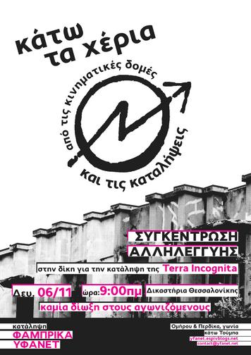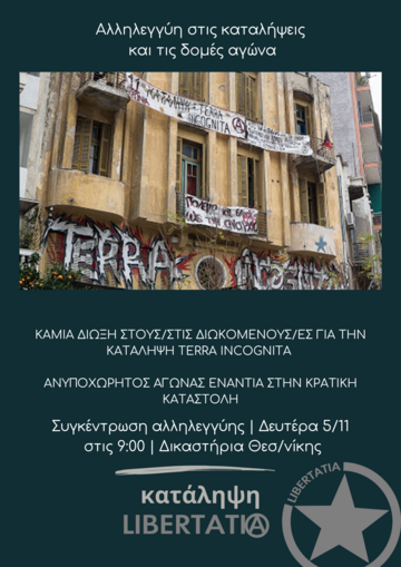 Δευτέρα 6/11 στις 9:00, δικαστήρια Θεσ/νίκης | Συγκέντρωση αλληλεγγύης στους/ις διωκόμενους/ες της εκκένωσης της κατάληψης Terra Incognita