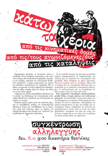 Συγκέντρωση Αλληλεγγύης Δευτέρα 6 Νοεμβρίου στις 9:00-Δικαστήρια Θεσσαλονίκης