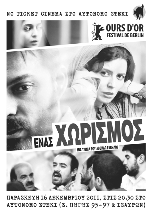 Την Παρασκευή στις 20.30 στο Αυτόνομο Στέκι Ζ. Πηγής 95-97 & Ισαύρων, θα προβληθεί η ταινία του Asgahar Farhadi : "ένας χωρισμός"