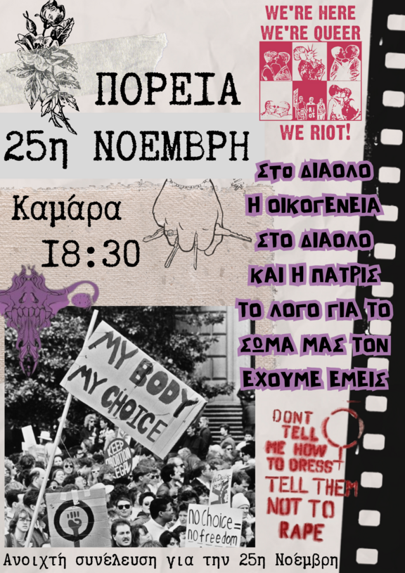 Η 25η Νοέμβρη θεσμοθετήθηκε από τον ΟΗΕ ως ημέρα για την εξάλειψη της βίας κατά των γυναικών. Η συγκεκριμένη μέρα έχει καθιερωθεί από το 1991, όταν γυναικείες οργανώσεις θέλησαν να τιμήσουν τη μνήμη των τριών αδελφών Μιραμπάλ από τη Δομινικανή Δημοκρατία που βασανίστηκαν, ξυλοκοπήθηκαν και στραγγαλίστηκαν μέχρι θανάτου, κατ' εντολήν του δικτάτορα Τρουχίλο, στις 25 Νοεμβρίου 1960. Η ημέρα αυτή -όχι επειδή μας ενδιαφέρει να περιχαρακώνουμε τον αγώνα μας ενάντια στην πατριαρχία σε μία ή δύο ημέρες το χρόνο- είναι ευκαιρία αποδόμησης και επανανοηματοδότησης, ευκαιρία να ανοίξει το ζήτημα της έμφυλης βίας στη πόλη και να συλλογικοποιηθούμε με σκοπό να αντιπαραθέσουμε τα δικά μας θέλω και προτάγματα. Είναι εξάλλου γνωστή τακτική του κράτους και θεσμικών φορέων να χρησιμοποιούν πολιτικά γεγονότα ανάγοντάς τα σε διεθνείς μέρες και γιορτές, σε μια προσπάθεια να αφαιρέσουν τα χαρακτηριστικά τους και να τα αποπολιτικοποιήσουν.Η έμφυλη βία, όμως, είναι καθημερινή και η οργή μας δεν χωράει σε καμία μέρα.