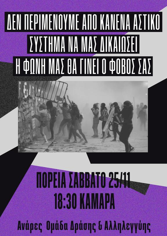 Δεν ξεχνάμε κανένα θύμα έμφυλης βίας, γι' αυτό και την 25η Νοέμβρη θα είμαστε στον δρόμο, με όπλο μας την αλληλεγγύη και η μια δίπλα στο άλλο να δηλώσουμε την εναντίωση μας σε πατριαρχία, κράτος και οποιαδήποτε εξουσία.