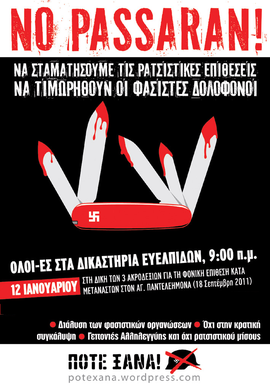 Αναβολή Αντιφασιστικής Κινητοποίησης 12/1 Η αντιφασιστική κινητοποίηση της Πέμπτης 12/1 στα δικαστήρια της Ευελπίδων σχετικά με τη δίκη 3 φασιστών για το μαχαίρωμα Αφγανού πρόσφυγα δεν θα πραγματοποιηθεί, λόγω της αποχής των δικηγόρων και της συνεπαγόμενης αναβολής όλων των δικών της ημέρας εκείνης. Η νέα ημερομηνία της αντιφασιστικής κινητοποίησης θα ανακοινωθεί τις επόμενες, όταν θα γνωρίζουμε την ημερομηνία της εξ'αναβολής δίκης. Η Αντιφασιστική Πρωτοβουλία "ΠΟΤΕ ΞΑΝΑ", καλεί κάθε εργαζόμενο και νέο, ντόπιο και μετανάστη-ρια που δεν ανέχεται τη φασιστική βία, σεκινητοποίηση στα δικαστήρια της Ευελπίδων, τη Δευτέρα 30 Ιανουαρίου, οπότε δικάζεται η νεοναζιστική συμμορία των "Αυτόνομων Εθνικιστών", που τον Ιανουάριου 2010, είχε επιτεθεί σε αντιρατσιστική κινητοποίηση φορέων, συλλόγων και οργανώσεων των Αμπελοκήπων στην πλατεία μετρό Πανόρμου. ΚΑΤΑΔΙΚΗ ΤΩΝ ΦΑΣΙΣΤΩΝ ΔΟΛΟΦΟΝΩΝ ΔΙΑΛΥΣΗ ΤΩΝ ΦΑΣΙΣΤΙΚΩΝ ΣΥΜΜΟΡΙΩΝ Αντιφασιστική Πρωτοβουλία "ΠΟΤΕ ΞΑΝΑ"