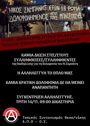 Συγκέντρωση αλληλεγγύης στα 4 συλληφθέντα της πορείας για την κρατική δολοφονία του Ν. Σαμπάνη στα δικαστήρια την Τρίτη 14/11 στις 9.00