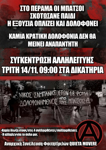 Τα ξημερώματα του Σαββάτου 23/10/21 ο 18χρονος Ρομά Νίκος Σαμπάνης πέφτει νεκρός μετά από καταδίωξη από μπάτσους της ομάδας ΔΙΑΣ στο Πέραμα. Μόλις το αυτοκίνητο στο οποίο επέβαινε ακινητοποιήθηκε, οι ένστολοι δολοφόνοι πυροβόλησαν 38 φορές σκοτώνοντας εν ψυχρώ τον Νίκο Σαμπάνη και τραυματίζοντας σοβαρά τον 16χρονο φίλο του. Από τότε έχει μεσολαβήσει η δολοφονία του 16χρονου Ρομά από τον οικισμό της Αγίας Σοφίας Κώστα Φραγκούλη και μόλις πριν λίγες μέρες ( ξημερώματα Κυριακής 12/11) η εκτέλεση του 17χρονου Ρομά Χρήστου Μιχαλόπουλου από μπατσο της ΟΠΚΕ στη Βοιωτία.