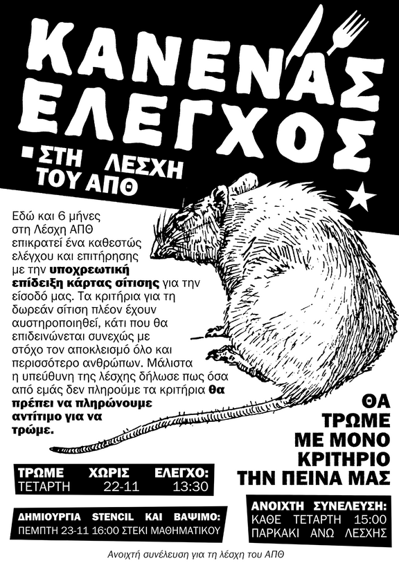 Εδώ και 6 μήνες στη Λέσχη ΑΠΘ επικρατεί ένα καθεστώς ελέγχου και επιτήρησης με την υποχρεωτική επίδειξη κάρτας σίτισης για την είσοδό μας. Από την άνοιξη γίνονται συνεχείς προσπάθειες παρέμβασης στη λέσχη και σπάσιμο των ελέγχων τόσο από οργανωμένο κόσμο όσο και από άτομα που αρνούνται να πειθαρχήσουν στη νέα τάξη των πραγμάτων που επιβάλλει ο εργολάβος. Σε κάθε παρέμβαση οι διανομές έκλειναν εκδικητικά, μια πρακτική που συνεχίζεται μέχρι και σήμερα. Με αυτό το τέχνασμα δημιουργούνται συνθήκες κοινωνικού αυτοματισμού καθώς πολλοί φοιτητές σκέφτονται πως για τη διακοπή της τροφοδοσίας ευθύνονται οι δικές μας παρεμβάσεις, ταυτόχρονα ο εργολάβος δεν χάνει χρήματα όταν σταματάει τις διανομές με αυτόν τον τρόπο.