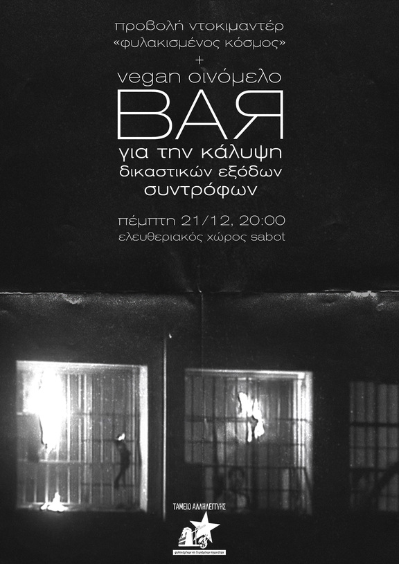 Προβολή ντοκιμαντέρ "φυλακισμένος κόσμος" + Vegan οινόμελο bar για την κάλυψη δικαστικών εξόδων συντρόφων