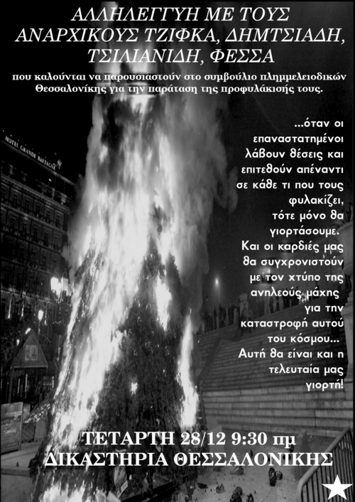 Οι Τζίφκας,Δημτσιάδης, Τσιλιανίδης, Φεσσάς καλούνται να παρουσιαστούν στο συμβούλιο πλημμελειοδικών Θεσσαλονίκης για την παράταση της προφυλάκισής τους για την υπόθεση εμπρησμού οχήματος της ΔΕΗ. Για την ίδια υπόθεση βρίσκεται προφυλακισμένος και ο σύντροφος Γιάννης Σκουλούδης από τις 13/10/10.
