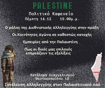 Την Πέμπτη 14.12 στην Κατάληψη Ευαγγελισμού στο Ηράκλειο θα πραγματοποιηθεί μια ανοιχτή συζήτηση γύρω από την Παλαιστίνη και τα γεγονότα εκεί, με σκοπό πάντα το μοίρασμα και την ζύμωσή μας!