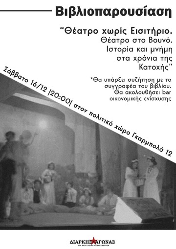 Το Σάββατο 16 Δεκεμβρίου στις 20.00, στον πολιτικό χώρο του Διαρκούς Αγώνα για την ταξική απελευθέρωση στη Θεσσαλονίκη -Γκαρμπολά 12- θα πραγματοποιηθεί παρουσίαση του νέου βιβλίου των εκδόσεων "Δυσήνιος Τύπος" με τίτλο "Θέατρο Χωρίς εισιτήριο".