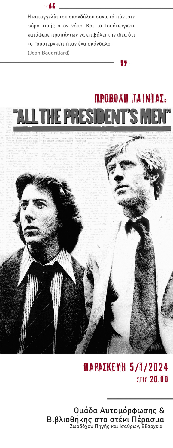 Την Παρασκευή 5/1/2024 στις 20.00 στα πλαίσια της ενασχόλησης μας με το "Ομοιώματα και Προσομοίωση" του Jean Baudrillard θα προβάλουμε την ταινία All the President's Men (Alan J. Pakula).