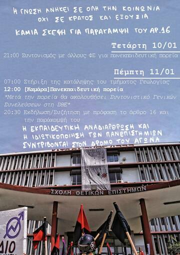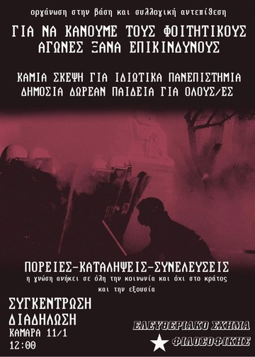 Κάλεσμα στήριξης των διαδηλώσεων (Πέμπτη 11/1) ενάντια στο νομοσχέδιο για την ίδρυση ιδιωτικών πανεπιστημίων