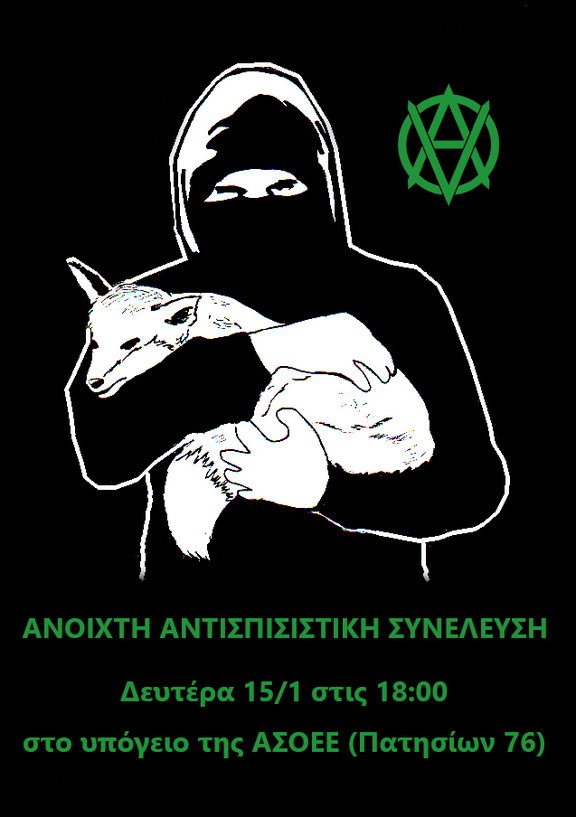 Καλούμε στην ενίσχυση του αγώνα για την απελευθέρωση των ζώων με την συμμετοχή σε αδιαμεσολάβητες και αντιιεραρχικές συναντήσεις που προσβλέπουν στη παραγωγή δράσεων και προπαγανδιστικών ενεργειών όπως ακριβώς οφείλουμε να κάνουμε σε κοινωνικό και ταξικό επίπεδο.