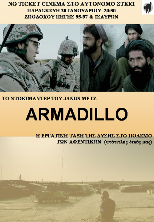 Την Παρασκευή 20 Γενάρη, στις 20.30 θα προβληθεί στο Αυτόνομο Στέκι Ζ. Πηγής 95-97 & Ισαύρων το ντοκιμαντέρ του JanusMetz: «Armadillo». Η εργατική τάξη της δύσης στον πόλεμο των αφεντικών της (ο υπότιτλος δικός μας)