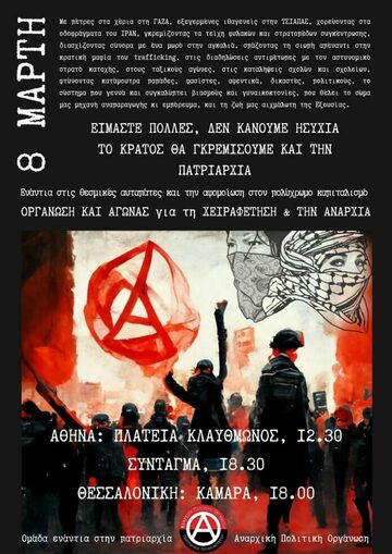Το εξουσιαστικό πατριαρχικό καπιταλιστικό σύστημα επιτίθεται, προωθώντας τη βία εναντίον των γυναικών και όλων των καταπιεσμένων. Η πατριαρχική βία είναι συστημική βία και είναι οργανικό κομμάτι του εξουσιαστικού και καπιταλιστικού κόσμου. Αποτελεί ένα ακόμα όπλο στην φαρέτρα του συστήματος για τη διαίρεση των καταπιεσμένων, για τη διάχυση του κοινωνικού κανιβαλισμού και την επιβολή της σιωπηρής αποδοχής των ανισοτήτων που το ίδιο αναπαράγει. Γι' αυτό απέναντι στη ζοφερή πραγματικότητα που μας επιφυλάσσουν οι εξουσιαστές σε ολόκληρο τον πλανήτη, προτάσσουμε την οργάνωση των από τα κάτω και τη διεκδίκηση όσων μας ανήκουν, την οργανωμένη ταξική αντεπίθεση των εκμεταλλευόμενων, γυναικών και ανδρών, για την ανατροπή του κόσμου της πατριαρχίας, του κράτους και του καπιταλισμού, για τη δημιουργία μιας κοινωνίας χωρίς εκμετάλλευση και καταπίεση. Γνωρίζουμε καλά πως η αλλαγή θα έρθει από τα κάτω, με αντιιεραρχικούς αγώνες, με αλληλεγγύη και μαχητική αντίσταση, αδιαμεσολάβητα. Με γυναίκες που στέκονται η μια δίπλα στην άλλη και χτίζουν κοινότητες αγώνα, μέσα από τις οποίες θα μπορούν να επικοινωνήσουν και να μιλήσουν για όσα βιώνουν, που δεν σιωπούν απέναντι στη βία αλλά αγωνίζονται για να την εξαλείψουν. Ως αναρχικές και ως γυναίκες δηλώνουμε ξεκάθαρα πως κράτος και καπιταλισμός θα γκρεμιστούν μέσα από την οργάνωση μας, μέχρι το χτίσιμο κοινοτήτων αξιοπρέπειας και ελευθερίας παντού.