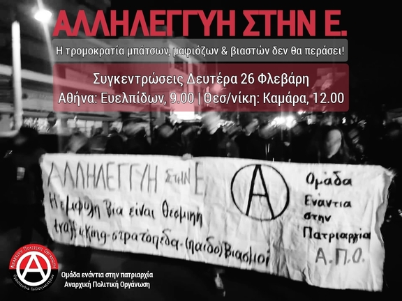 Τη Δευτέρα 26/02 εχει οριστεί η δίκη με κατηγορούμενη την Ε. Γι'αυτό κι εμείς θα είμαστε στο δρόμο για να δηλώσουμε ότι δε θα αφήσουμε καμια γυναίκα μόνη απέναντι στη βία της πατριαρχίας, τους εκφοβισμούς των μαστροπών, τη συγκάλυψη των μπάτσων και το ξέπλυμα της δικαστικής εξουσίας.Ο μόνος δρόμος είναι ο συλλογικός μας αγώνας και θα τον δώσουμε με όλες μας τις δυνάμεις ώστε να μη βρεθεί καμία μόνη απέναντι στους δυνάστες που εξουσιάζουν τις ζωές μας! Σφίγγουμε τις γροθιές μας και στεκόμαστε δίπλα σε κάθε γυναίκα τραυματισμένη από τη λεπίδα της πατριαρχίας! Η συλλογική μας φωνή μπορεί να σπάσει όλα τα δεσμά & να ρίξει όλα τα τείχη! Οργανωνόμαστε & αγωνιζόμαστε η μία δίπλα στην άλλη μέχρι να μετατρέψουμε εκείνη τη μικρή φλόγα σε ολόκληρη φωτιά που θα κάψει συθέμελα το σάπιο, εξουσιαστικό, πατριαρχικό σύστημα που μας καταπιέζει, μας βιάζει, μας δολοφονεί!