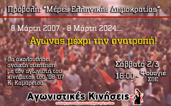 Οι Αγωνιστικές Κινήσεις διοργανώνουν προβολή του ντοκυμαντέρ "Μέρες Ελληνικής Δημοκρατίας", σχετικά με το κίνημα του '06-'07 και με την τεράστια πανελλαδική πορεία της 8ης Μάρτη 2007, μέρα ψήφισης του νόμου-πλαίσιου Γιαννάκου που χαρακτηρίστηκε από την ακραία καταστολή της αστυνομίας. 17 χρόνια μετά, την ίδια μέρα έχει τεθεί προς ψήφιση το ν/σ Πιερρακάκη για τα ιδιωτικά πανεπιστημία και το μήνυμα είναι ένα και κοινό. Συνέχιση του αγώνα μέχρι την ανατροπή! Μετά την προβολή, θα ακολουθήσει ανοιχτή συζήτηση στην οποία θα παρέμβει και ο Κ.Καμαρέτσος, αγωνιστής του κινήματος του '06-'07.